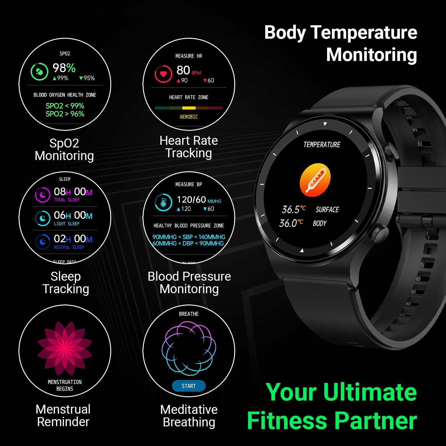 - 【360*360 High Retina Display Resolution】- 1.32 inches HD Color screen Full capacitive touch, supporting taps and swipes.; 【Temperature Monitoring】- The watch can monitor your temperature. 【SPO2/ Oxygen, Heart Rate】- Fire-Boltt 360 Pro Smartwatch comes with real time 24*7 SPO2 / Blood Oxygen tracking, Dynamic Heart Rate Monitoring