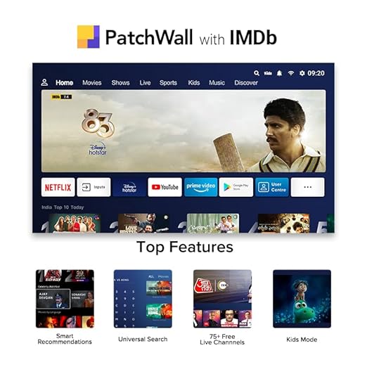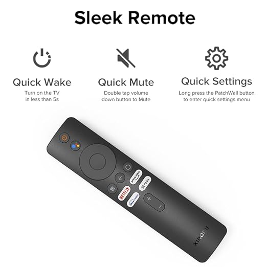 | Special Features | Android TV 11 | PatchWall | IMDb Integration | Universal Search | 300+ Free Live Channels | Kids Mode with Parental lock | Smart Recommendations | Language Universe – 15+ Languages | User Centre | Okay Google | Chromecast suporting Apps : Netflix, Prime Video, Disney+ Hotstar | 5000+ apps from Play Store |Quad core Cortex A35 | Chromecast built-in | Ok Google | Auto Low Latency Mode | 1GB RAM + 8GB Storage |