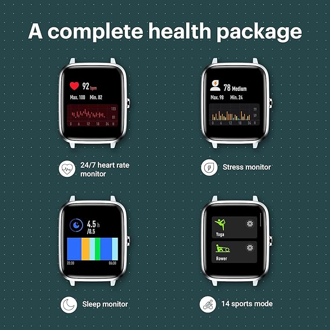 | Special Features | Oxymeter (SpO2), Heart Rate Monitor, Activity Tracker, Stress Tracking, Touchscreen, Water Resistant, |